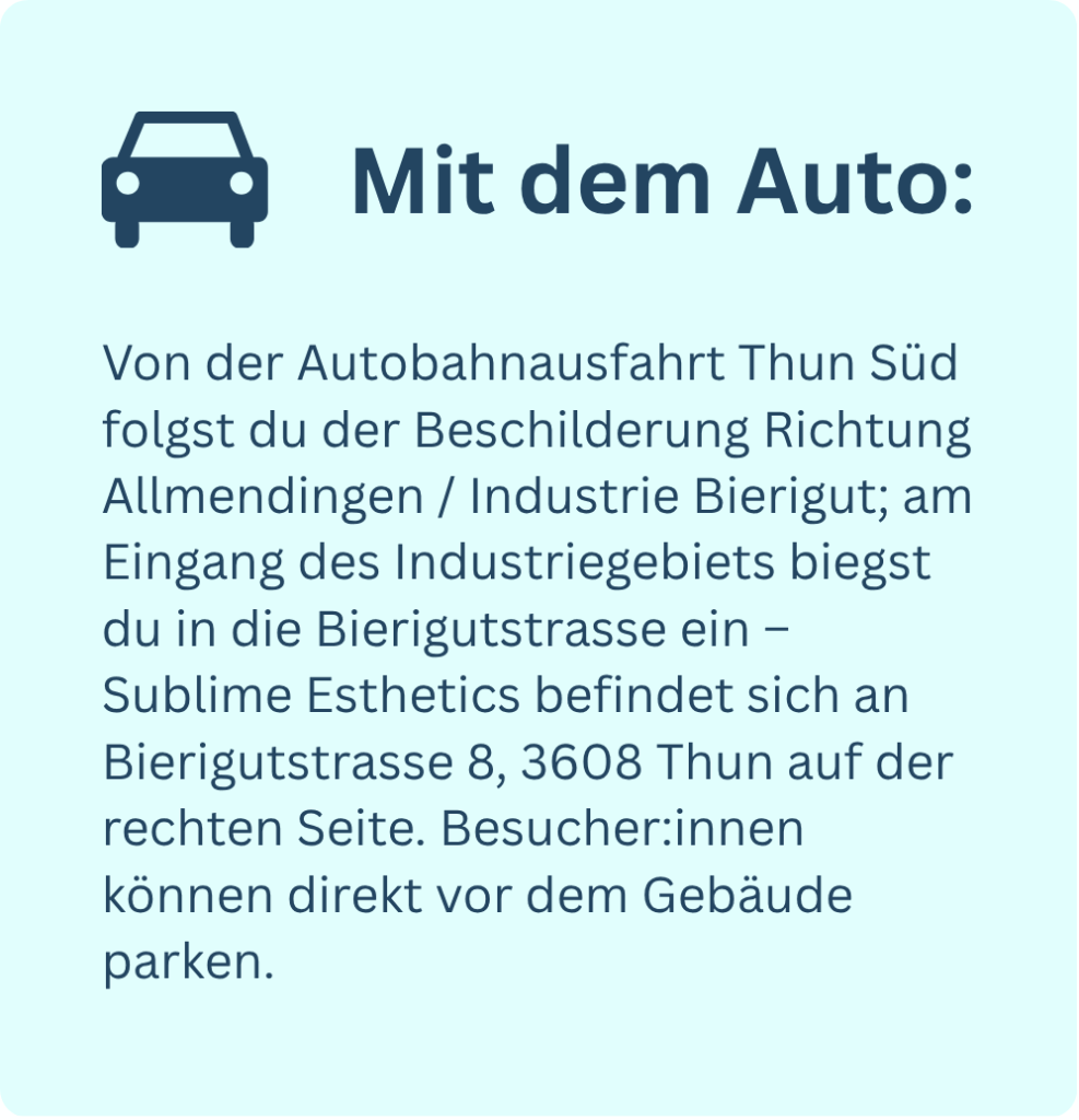 Nimm die Autobahnausfahrt Thun Süd und folge den Schildern Richtung Allmendingen (Industrie Bierigut). Für Besucher stehen Parkplätze zur Verfügung.