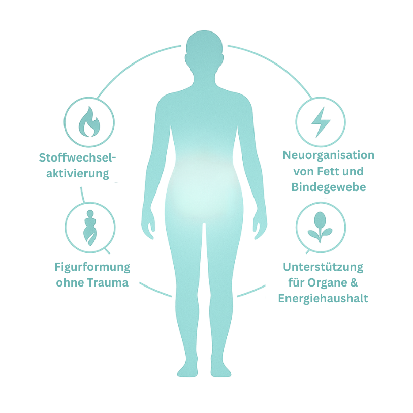 Anstatt Fett zu entfernen, aktivieren wir Prozesse, die dein Körper bereits kennt – aber oft verlernt hat: Fettverbrennung, Gewebestraffung, Durchblutung, Zellaktivierung und Entgiftung.